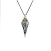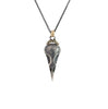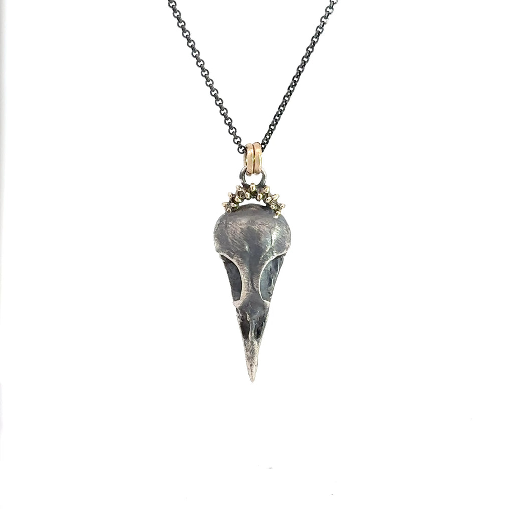 Cast from a natural bird skull, this pendant is an image of strength as well as mortality. Diamonds, sterling and 10k yellow gold mix to make this killer every day pendant.
