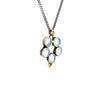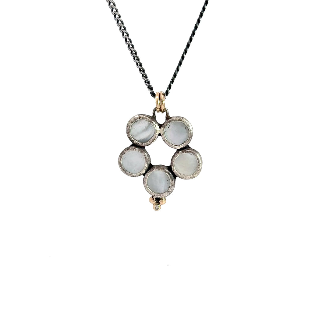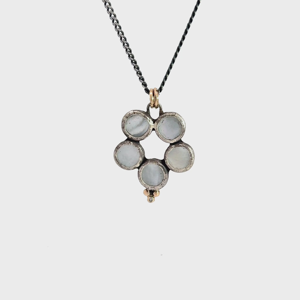 Like a cluster of glowing petals, this pendant blooms with soft, ethereal light. Five moonstones are gathered in a hand-textured setting, their subtle shimmer shifting with every movement. The oxidized silver chain adds a grounding contrast, while yellow gold details bring a touch of warmth with shimmering diamond accents.